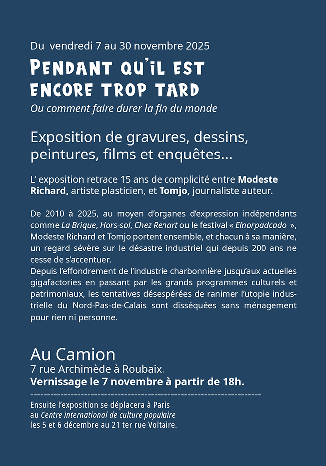 Il n’y a pas que « Le Groupe de Roubaix », à Roubaix, ce groupe artistique échafaudé tant bien que mal par la bourgeoisie textile locale, via le musée de La Piscine, pour se montrer en beauté et valoriser son paternalisme historique. Il y a aussi Modeste Richard et Tomjo, qui exposent du 7 au 20 novembre 2025, au Camion.